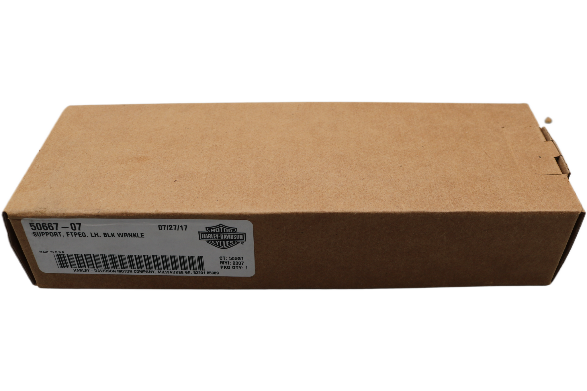 This listing is for a brand new, never used Harley-Davidson left-side rider footpeg bracket/mount, part number 50667-07. Finished in factory wrinkle black, this OEM part ensures a seamless appearance and reliable durability. Perfect for restoring your bike to OEM specs or completing a custom build with factory-grade components.
